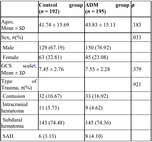Demographic information and type of trauma in control and AMD group SAH, subarachnoid hemorrhage; ADM, artificial dura materials; GCS, glasgow coma scale.