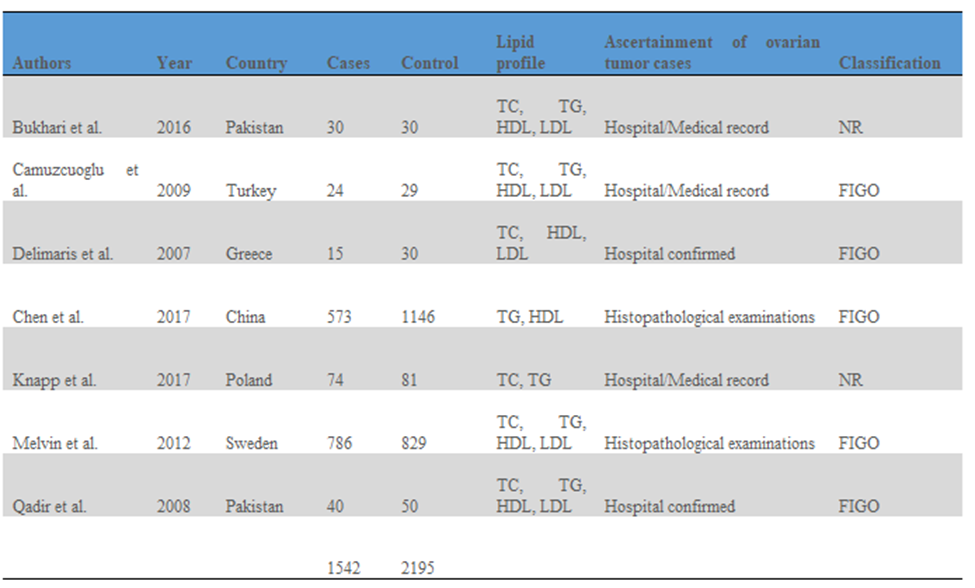 Mehods: The meta-analysis was conducted using the MOOSE guidelines. PubMed, EMBASE and Cochrane Library were extensively searched ( with a period of publication restriction between 2007 and 2019) to indetify published studies using the following keywords: “ total cholesterol ”, “high-density lipoprotein”, “ triglycerides ”, “ low-density lipoprotein ”, “ ovarian cancer”, “ ovarian tumor ”, “ lipid profile ”. The search methodology is shown in Fig. 1 and all references of retrieved articles were searched manually.
