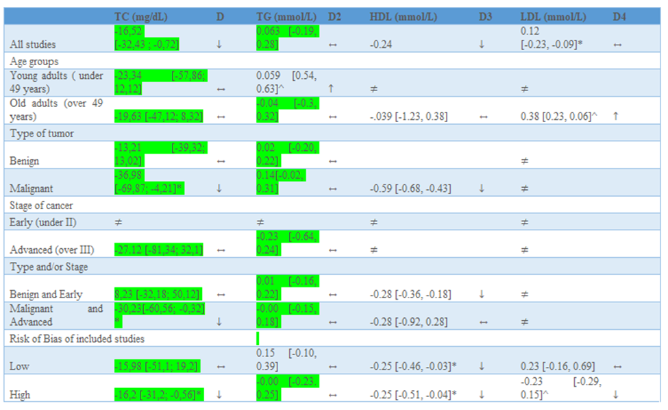 In the literature ovarian tumors are knowed to be one of the most deadliest gynecological malignancies. In US this type of malignancy represents 2.3 % of all cancer-related death and about 4 % of all new cancer cases among women. In the latest statistical cohort, there was an incidence of 11.6 cases/100.000 women per year, with an estimated 224.940 women living with this disease in the world. The simptomatology in ovarian tumors is hidden and about 70 % of patients are diagnosed in advanced stage, wich underlines that ovarian tumors are a serious public health concern. As we all know lipids are biologically important hydrophobic moleculs vital for energy storage, cell signalling and maintenance of cell membrane integrity. Lipids are transported in the bloodstream with the aid of lipoprotein. Lipids are widely distributed in cellular organells and used as biologically vital active molecules. There are several studies that have reported the role of lipid profiles and it’s role in ovarian tumorigenesis. Fatty acids are essential for cancer cells progression. In our study we investigated the true differance in circulating lipid profiles (total cholesterol TC, triglyceride TG, high-density lipoprotein cholesterol HDL, low density lipoprotein cholesterol LDL) among patients with and without ovarian tumors (OT) using a meta-analytical approach.