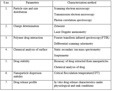 Characterization of nanoparticles is based on the size, morphology and surface charge, using advanced microscopic techniques as atomic force microscopy (AFM), Scanning electron microscopy (SEM), and TEM,etc. Properties such as the size distribution, average particle size diameter, charge affect the physical stability and the in vivo distribution of nanoparticles [11].