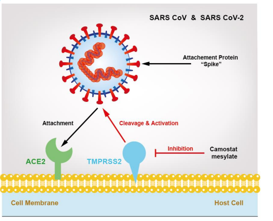 To enter the cell, it connects to the receptors of angiotensin converting enzyme 2 (ACE 2). Before connecting to them, it is activated by host enzymes called serine proteases (TMPRSS2).