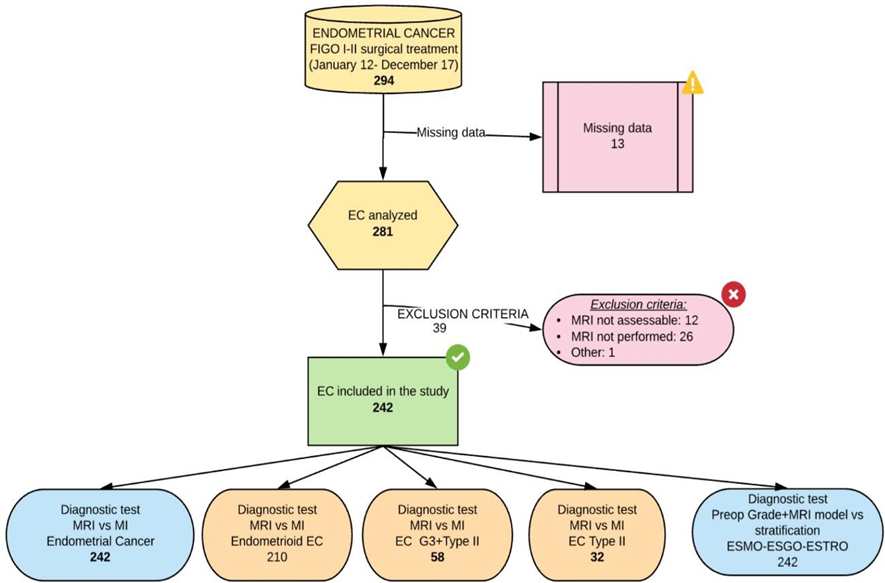 An observational retrospective cohort study was conducted including 294 patients diagnosed with endometrial carcinoma at Donostia University Hospital from January 2012 to December 2017. All patients were histologically diagnosed with endometrial carcinoma by preoperative endometrial biopsy, including histological type and grade. All patients underwent preoperative magnetic resonance imaging (MRI). Data were obtained from electronic health records.