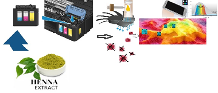 Developed Diagnosis Method: Artificial Body Fluids Test Solutions (simulated lung fluid, perspiration, saliva, urine), which are models containing representative components of the facts, were purchased from LC Tech Pickering Laboratories Company. Epson L3110 photo-ink sprayer printer (375 x 347 x 179 mm, AC 100 V - 240 V, print speed: 8 ppm) was used for staining protein with henna solution of Pickering artificial body fluids after and before Covid-19 adsorption. Positive or negative adsorption images were illuminated by colorimetric, algorithmic analysis on paper ground via smartphone. Quantitative and qualitative detection limits of adsorption due to henna staining intensity were quite good (LOD: 0.15 ppm, LOQ: 0.5 ppm). The adsorptions of four different artificial body fluids (simulated lung fluid, perspiration, saliva, urine) on a 2-dimensional paper floor were expressed in a [2x4] matrix linear coordinate plane consisting of -1 to +1 algorithmic variables (Table 1). Covid-19 contamination was achieved by exposing artificial body fluids to open air aerosols in pandemic hospitals and pharmacies where the patient density is high. Propellers providing negative airflow simultaneously with antiviral aroma therapeutic essential oil nebulizers were used to prevent contamination when transferring contaminated artificial body fluids to the printer cartridge chambers (Figure 1).