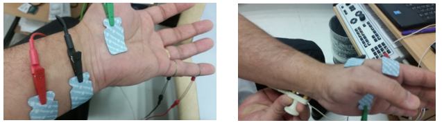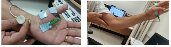 The procedure started by carrying out the sensory testing, by placing the stimulating ring electrodes on digit III (which is more sensitive than digit II4) and the recording electrode on the surface of the median nerve at the wrist. The orthodromic technique was used for the sensory and motor NCS test, through the median and ulnar nerves. A supramaximal stimulus was applied to record the full response of the nerve, at the digits II-IV for median sensory and digit V for ulnar sensory recording. A supramaximal current was applied to stimulate median nerve pathways at the wrist and at the elbow for motor recording from abductor pollicis brevis (APB)1 and ulnar nerve pathways from First dorsal interosseous (FDI). Digit II was stimulated only when either the response from digit III was less than 3µV or absent; digit IV was stimulated only when the response from digit III showed conduction velocity between 45-50m/sec. Amplitude was recorded from peak to peak for sensory responses, and base to peak for motor responses. If responses were not recordable from median sensory digit II, III and motor from APB muscles, then motor responses were elicited by placing recording electrodes on 2nd lumbricals by stimulating median and ulnar nerves at the wrist1,6,11,13. If the motor response from FDI shows more than 30% reduction in amplitude below and across elbow as compared to the wrist, the response elicited from median the nerve while recording from FDI was performed to identify the Martin Gruber anomaly. The distance from APB to wrist was kept between 6.5-7.5 cm while recording the motor median nerve.
