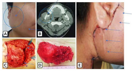 Figure 1: Pleomorphic adenoma. A) A well-defined mass within the right parotid region. B) ICT without invasion of adjacent structures. C) Initial dissection. D} Surgical piece. E) Closure of the surgical bed.
