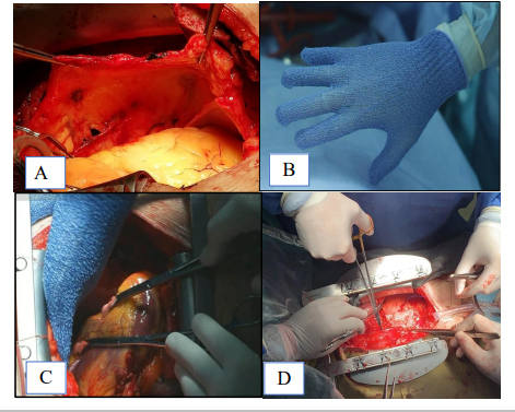 Figure. 1.Stages of the YurLeon technique –А-Subtotal pericardectomy. B-abrasive glove. С-mechanical desquamation of the epicardium and the remaining pericardium using the abrasive glove. D-the heart coated in paracardial fat.