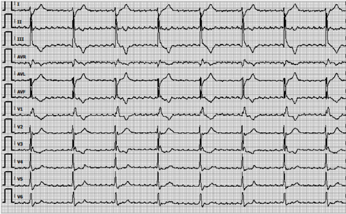 Figure 1: ECG with an atrium flutter and total AV-block provoked by inflammation in myocarditis.