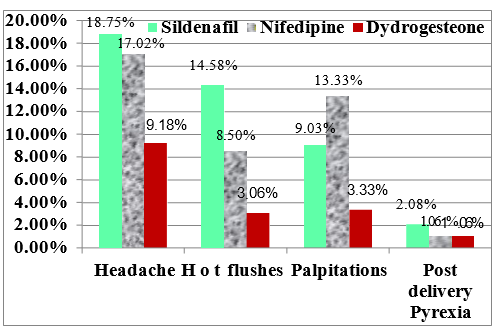 Drugs adverse effects were statistically significant among the 3 studied groups we had found that headache, palpitation and hot flushes more obvious in group I and II but less in group III (figure 3). Many previous studies had been discussed the efficacy of progesterone, calcium channel blockers or any of the other tocolytics in prevention of threatened preterm labor, from those studies, Ladan et al. [24] studied the comparative efficiency between Nifedipine and intramuscular progesterone, the success rates with intramuscular progesterone and oral Nifedipine were 83% and 82.7%, respectively but there was no a statistically significant difference in the previously mentioned 2 agents concerning the gestational age at time of delivery, mode of delivery, neonatal birth weight, in the rate of NICU admission and hospitalization period, These results and findings were in harmony with that reported in our study as regards to neonatal outcome but in our study the prevalence of preterm labor was higher in Dydrogesterone than Nifedipine this may can be explained because of the route and type of progesterone was different from that used in Ladan et al. The mechanisms of progesterone in prevention of preterm labor is by maintainance of uterine quiescence by varioust actions such as relaxation of uterine smooth muscle, blocking oxytocin action, prevention of the gap junctions formation, reducing the oxytocin receptors concentration in uterine smooth muscles and inhibiting the production of prostaglandins by amnion, chorion and decidua [25]. In a study performed by Wilasinee and Vorapong, [26] as the study had compared oral dydrogesreone (20 mg daily) and placebo in a randomized double blinded controlled trial, the study results were (Rates of recurrent uterine contractions in both groups were 87.5% versus 91.7%, p value was 0.64 and there were no differences in latency periods between both groups 32.7 ± 20.2 days versus 38.2 ± 24.2 days with p value was 0.39 so Wilasinee and Vorapong, study recommended that adjuvant treatment with oral Dydrogesterone 20 mg/day could not decline the rate of recurrent uterine contractions and prolong latency periods in preterm birth management in comparison with placebo and these findings agreed with our study results. But in another study reported by Bomba-Opon et al. [27] that was a retrospective review of usage of 200 mg progesterone vaginally after tocolysis by fenoterol or verapamil in threatened preterm birth and had found that it was associated with prolongation of gestational period in comparison to no medication (7.6 versus 6.3 weeks with p value was 0.039).