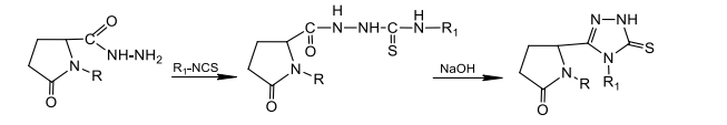 The synthesis of 5-(4-methyl-(phenyl)-5-thioxo-4,5-dihydro-1H-1,2,4-triazole-3-yl)-pyrolidin-2-ones by a team of French scientists proves the prospects of new substituted 1,2,4-triazole [21]. 1-R-5-oxo-pyrrolidine-2-carbohydrazide was used as the starting compound (Figure. 4).