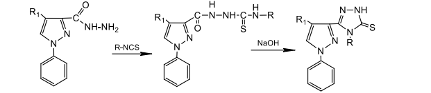 Figure 5: Synthesis scheme of 4-R-3-(4-R1-1-phenyl-1H-pyrazole-3-yl)-1H-1,2,4-triazole-5(4H)-thions
