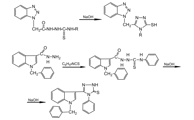 Figure 7: Synthesis scheme of 5-((1H-benzo-1,2,3-triazole-1-yl)methyl)-4-R-4H-1,2,4-triazole-3-thiols and 3-(1-benzyl-1H-indol-3-yl)-4-phenyl-1H-1,2,4-triazole-5(4H)-thion