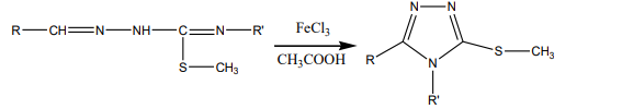 Cyclocondensation of the 1,2,4-triazole-3-thions and R-(aminomethylthiomethyl)-2-benzylidene hydrazides in the presence of ferrum (III) chloride in concentrated acetic acid takes place at a temperature of 90°C with short heating (Figure. 12).
