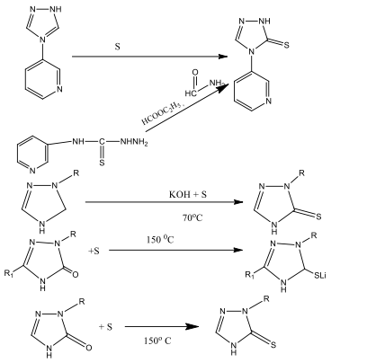 of our work was to summarize the available literary sources, the material which relates to the synthesis methods, studies of the physicochemical properties of 3-thio- and 3-thio-4-amino derivatives of the 1,2,4-triazole.