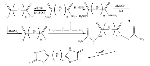 Figure 14: Synthesis scheme of 5,5'-alkylenebis(4H-1,2,4-triazole-3-thions)A well-known classic method for the synthesis of 3-thioderivatives of 1,2,4-triazole is the method described in the monograph [4-7]. Other sources convincingly prove that various alkyl-, aryl-, heterylcarboxylic acids can be used as starting compounds for the synthesis of 3-S-derivatives of 1,2,4-triazoles [4, 6] [ 8-10]. In future, 2-acylhydrazinocarbothioamides are obtained from hydrazides [11].