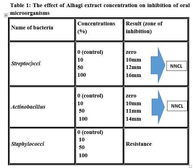 Table one showed that the use of different concentrations of Alhagi maurorum extract were used for three types of organisms. The concentrations of 0% has not any inhibition effect against oral microorganisms, when we used the concentration of 10%, has an slight inhibition effect against oral Streptococci and Actinobacillus, but has not effect on Staphylococci. When using 50%, has an inhibition effect against oral Streptococci more than Actinobacillus, but has not effect on Staphylococci. Using 100%, has a wide inhibition effect against oral Streptococci more than Actinobacillus except Staphylococci has not effect.