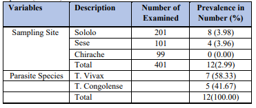 From total of 401 cattle, 12 of them were detected as positive for infection using a Buffy coat technique with an overall prevalence of 2.99 %. Regarding to the infected animals across the study sites were 3.98 and 3.96 % from Sololo and Sese peasant associations, respectively. However, in contrast to this there were no any infected cattle found in Chirache peasant association. T. Vivax (58.33%) was the most prevalent trypanosome species and the rest 41.67% was recorded for T. Congolense species (Table 1).