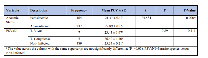 Among the total (401) examined cattle, 164 of them were parasitemic and they found to be anemic (PCV ≤ 24%) compared to aparasitemic (237) cattle and the difference was statistically significant at (P < 0> 0.05). The result of this finding is in agreement with the study report of Zemedkun et al. [34] from the three selected districts of Wolayita Zone, Southern Ethiopia.