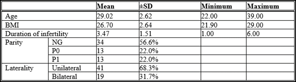 The above table shows that the mean age among study cases was 29.02± 2.6, and the mean BMI was equal to 26.7± 2.64. The duration of infertility was 3.4± 1.5 years. More than half of cases were nulligravida (56.6%). Unilateral case represented 68.3% of cases