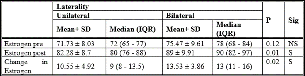 Table 8: Comparison between cases according to affected side as regard Estrogen before and after intervention and change after intervention