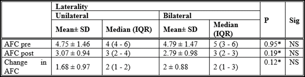Table 9: Comparison between cases according to affected side as regard AFC before and after intervention and change after intervention