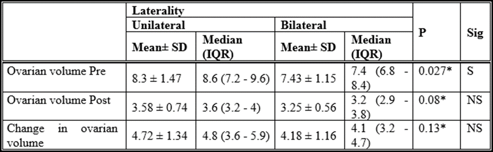 Table 10: Comparison between cases according to affected side as regard Ovarian volume before and after intervention and change after intervention