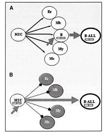 Firstly, this rearrangement and the transcription factor AF4 which results from t(4;11)(q21;q23) were identified from normal children and fetuses as well as fetal liver samples. Then some researchers , the rearrangement detected in healthy individuals. Sequence analysis of individual providing evidence that these rearrangements are not restricted to malignant cells and that they may also be present in a subset of normal hematopoietic cells. Secondly, abnormalities of the MLL gene at chromosome region 11q23 are seen in the 5% to7% of cases of ALL, as well as in AML. We can say , translocation t(11;19)(q23;p13.3) is the next most frequent MLL abnormality in ALL but also occurs in AML(monocytic)What does it mean? We have the fusion gene abnormality in two different lineages including myeloid series and the other lymphoid series. Is this fusion gene a specific abnormality or nonspecific abberation? What about the production of the fusion gene in two different lineages? Are these the same?[9-15,17-18]Therefore, we must have a better understanding about the interaction of HSCs with stromal cells and other important agents like genetic abnormalities such as cytogenetic and molecular genetic which can provide therapeutic targets for manipulation to modulate HSCs and their progeny in the diseases, in addition, the rearrangement has been reported in normal persons too.