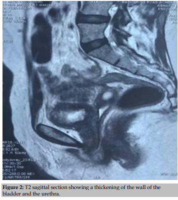 Magnetic resonance imaging (MRI), performed in August 2018, revealed a regular and significant non-tumoral thickening of the urethral walls over 20 mm, its walls are in T1 isosignal and T2 hypersignal with regular thickening. bladder walls and a collapsed vaginal cavity (Fig. 2).