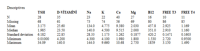 In the table below, the average values of patients' TSH, K, Na, Mg, B12, T3, and T4