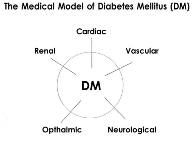 From the medical point of view there are five complications of diabetes mellitus namely, cardiac, vascular, renal, ophthalmic and neurological. We can visualise this simply as a hub called diabetes mellitus with spokes for the above complications (Figure 1).