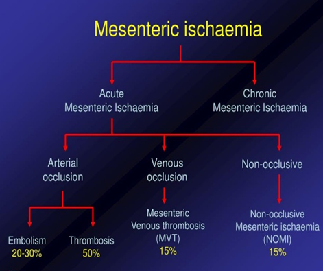 Mesenteric ischemia refers to ischemia of small intestine, whereas colonic ischemia refers to ischemia of large intestine. Bowel ischemia can be acute or chronic, depending upon how quickly the occlusion of vessels of intestine occurs. In acute ischemia, there is sudden occlusion of a blood vessel supplying the intestine. It is mostly embolic or thrombotic in nature and requires immediate surgery. In contrast, chronic mesenteric ischemia occurs when there is slow narrowing of blood vessels supplying the intestine, giving sufficient time for collateral circulation to develop, preventing intestinal necrosis.