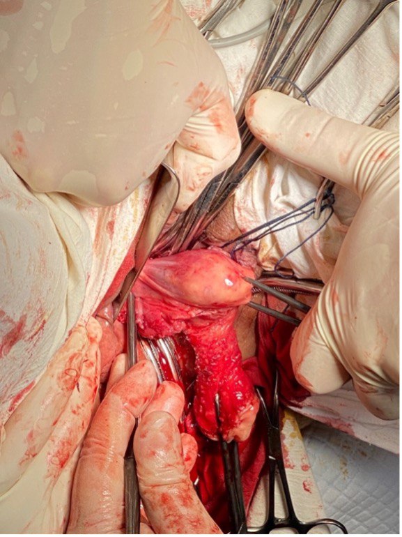 A vaginal hysterectomy with uterine appendages was performed, which was accompanied by increased tissue bleeding, given the recent inflammatory process with thickening of all anatomical structures of the small pelvis and, first of all, the ligamentous apparatus of the uterus and the walls of the bladder and vagina. Total blood loss was about 200.0 mL. Duration of the operation 1 hour 15 minutes.